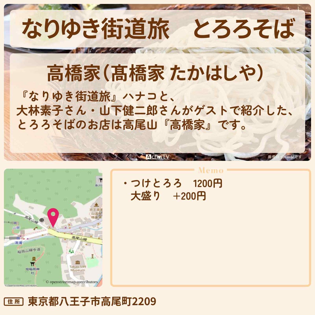 #なりゆき街道旅 高尾山 とろろそば #ハナコ と、 #大林素子 さん・ #山下健二郎 さんがゲスト 創業195年!柿の巨木が天を貫く名店の絶品そば 『高橋家』の情報を紹介 【住所】 東京都八王子市高尾町2209 詳しくは👉 activitv.com/entry/nariyuki… pic.x.com/Z6fxjFK4Nn