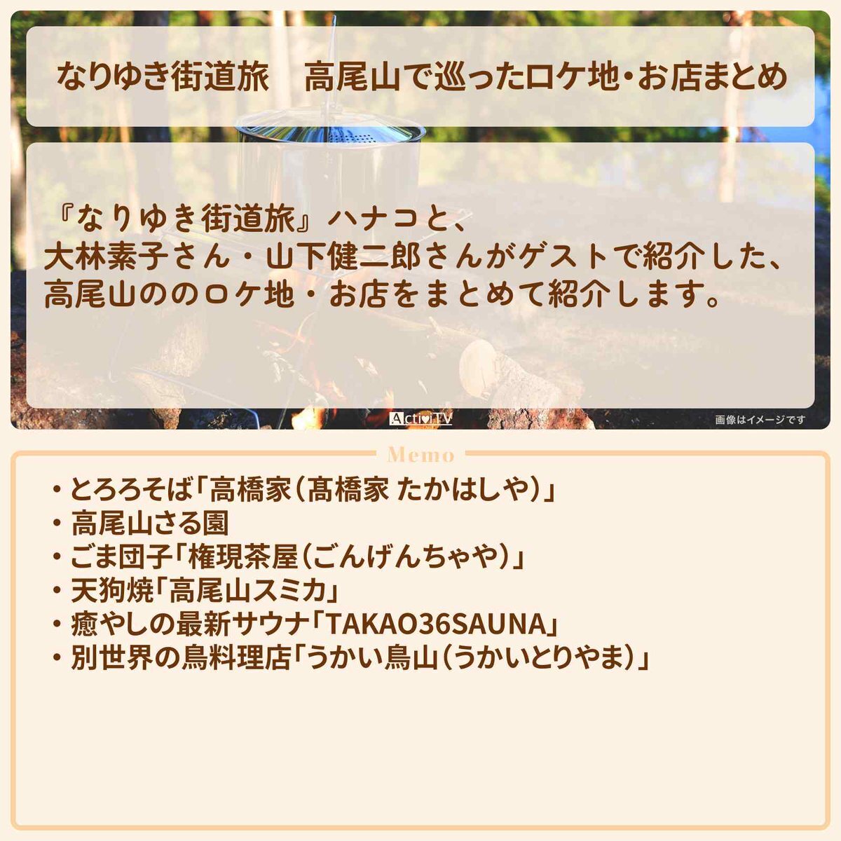 #なりゆき街道旅 高尾山のロケ地・お店まとめ #ハナコ と、 #大林素子 さん・ #山下健二郎 さんがロケ とろろそば▶︎高橋家 高尾山さる園 ごま団子▶︎権現茶屋 天狗焼▶︎高尾山スミカ TAKAO36SAUNA 鳥料理店▶︎うかい鳥山 詳しくは👉 activitv.com/entry/nariyuki… #三代目JSB pic.x.com/espU6ZEIHl