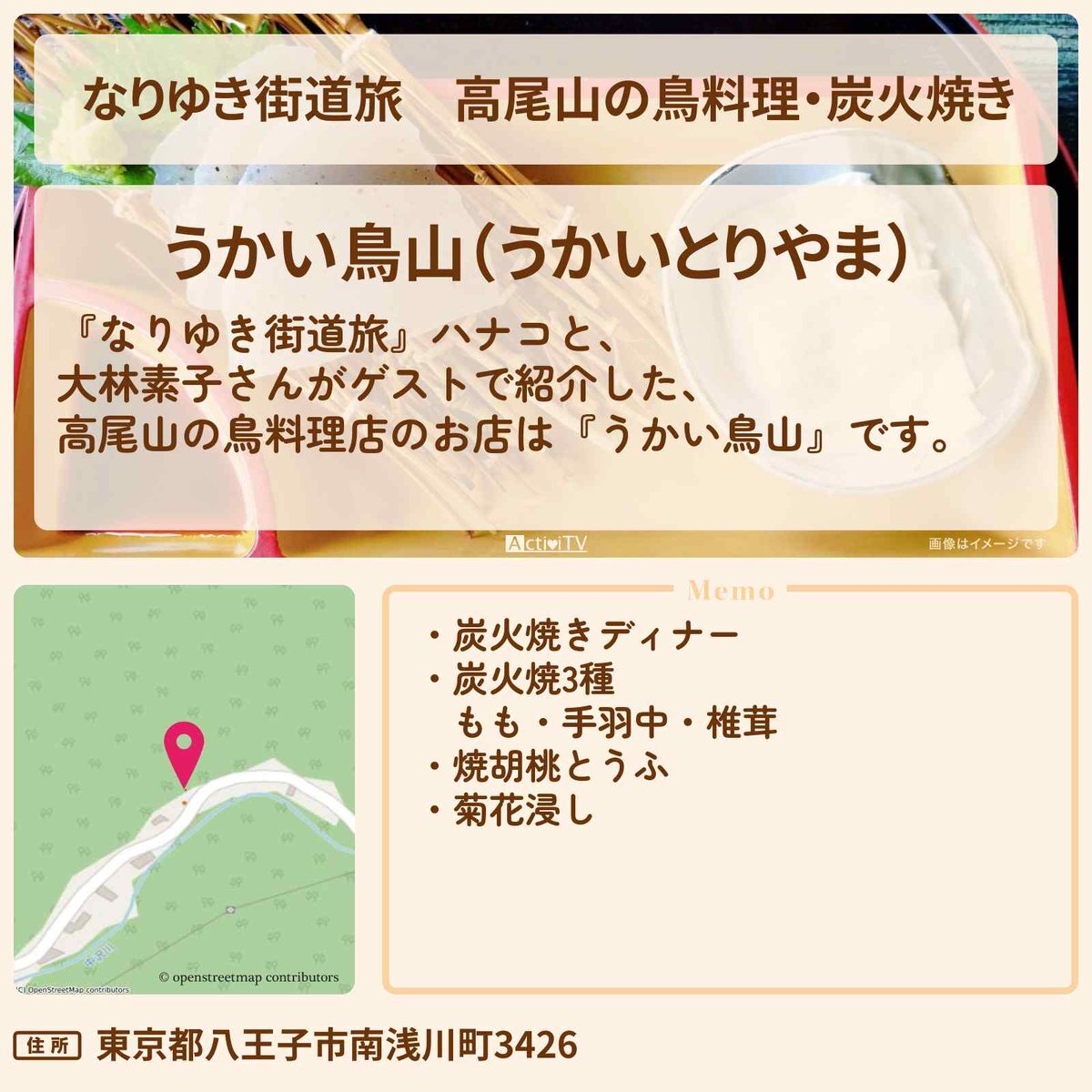 #なりゆき街道旅 高尾山の鳥料理・炭火焼き #ハナコ#大林素子 さん・ #山下健二郎 さんがゲスト 『うかい鳥山』の情報を紹介 【住所】 東京都八王子市南浅川町3426 詳しくは👉 activitv.com/entry/nariyuki… #なりゆき街道旅 #大林素子 #山下健二郎 #ハナコ pic.x.com/nWICQ1COFN