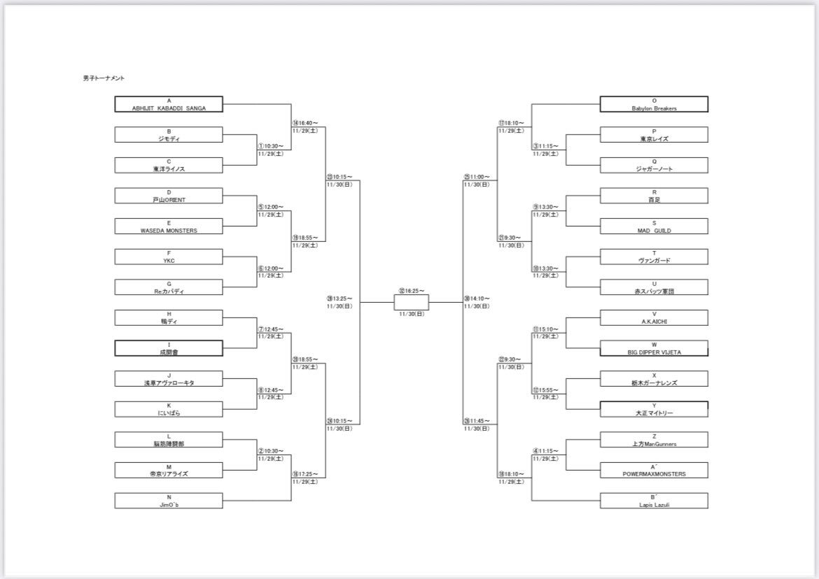 今週末に控えた全日本大会のトーナメント表が出ました! 11月29日の初戦は、大正マイトリーは15時55分から栃木ガーナレンズと対戦します! YKCは16時40分から摩那と対戦します! #カバディ #大正大学 pic.x.com/oCwCBbo85T