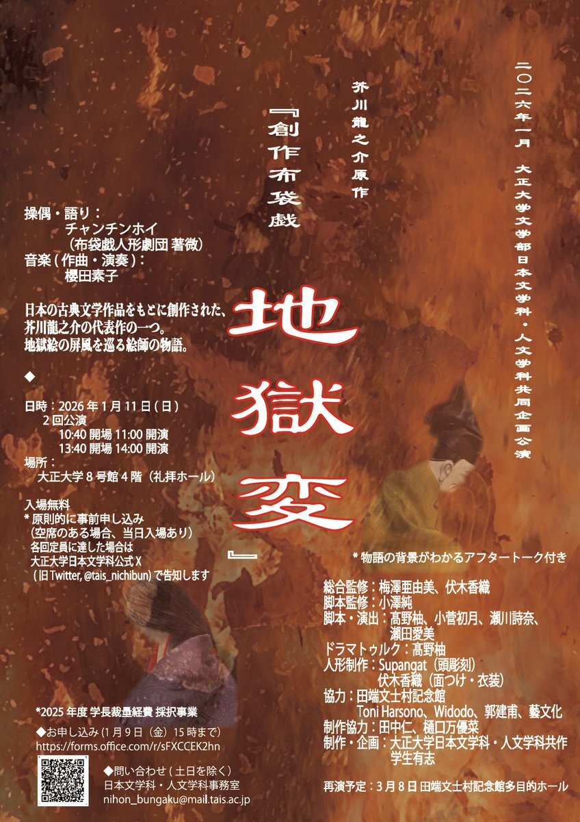 創作布袋戲 芥川龍之介原作 『地獄変』 2026年1月11日(日) 大正大学 8号館4階(礼拝ホール) 10:40開場 11:00開演 13:40開場 14:00開演 制作企画:大正大学 日本文学科 人文学科共作 人形遣い 語り 布袋戲人形劇團 著微(チョビ) チャンチンホイ 音楽(作曲 演奏) 櫻田素子 詳しくは下記より…🙇