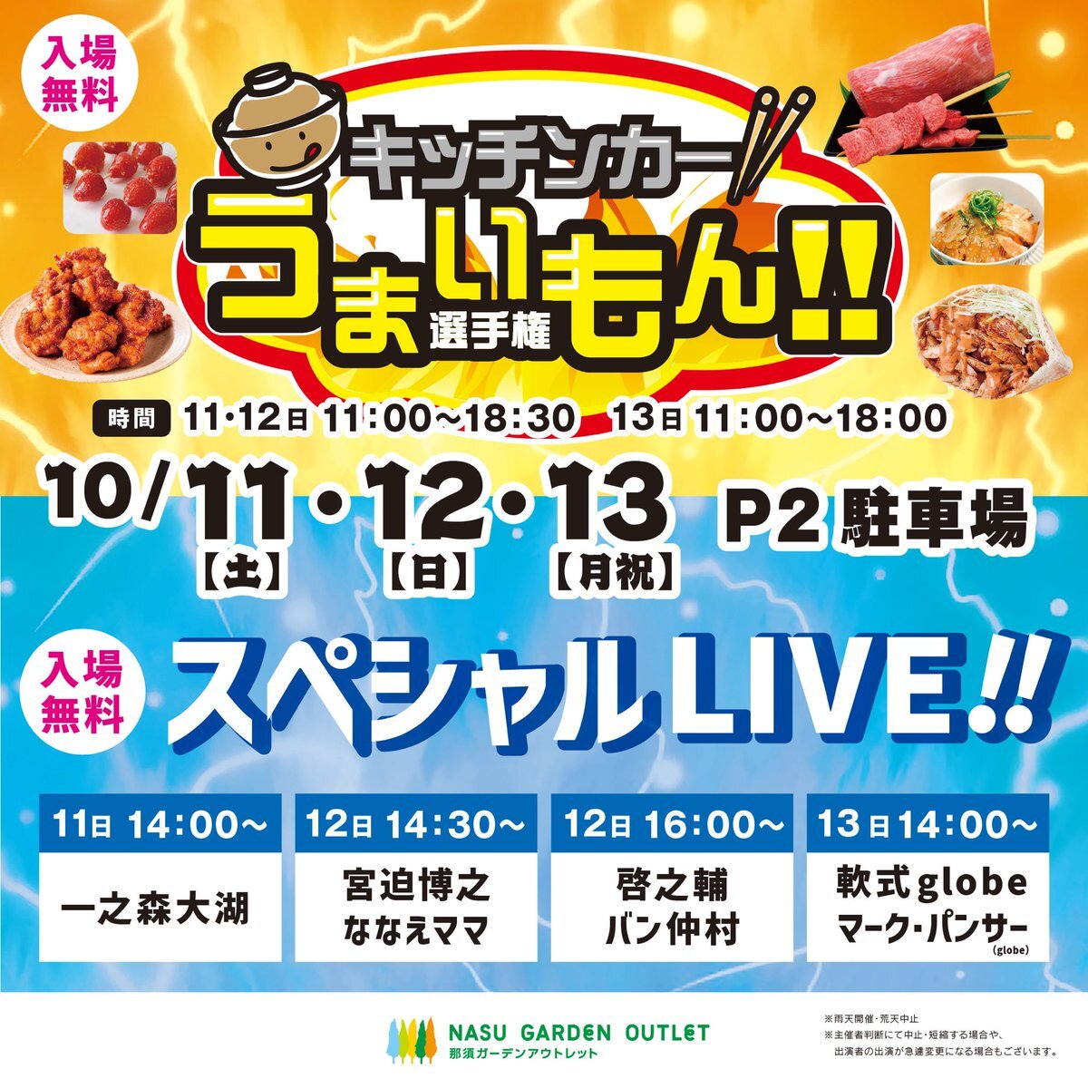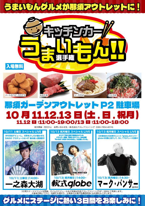 今年2回目のキッチンカーうまいもん選手権in那須大会 大会ポスターが出来上がりました! 今回も「うまいもんグルメ」が集結します。 グルメ内容は10月に発表します。 ステージイベントも開催! 10/11 「一之森大湖」@DaigoIchinomori 10/12 coming soon 10/13「マーク・パンサー」@marcpanther