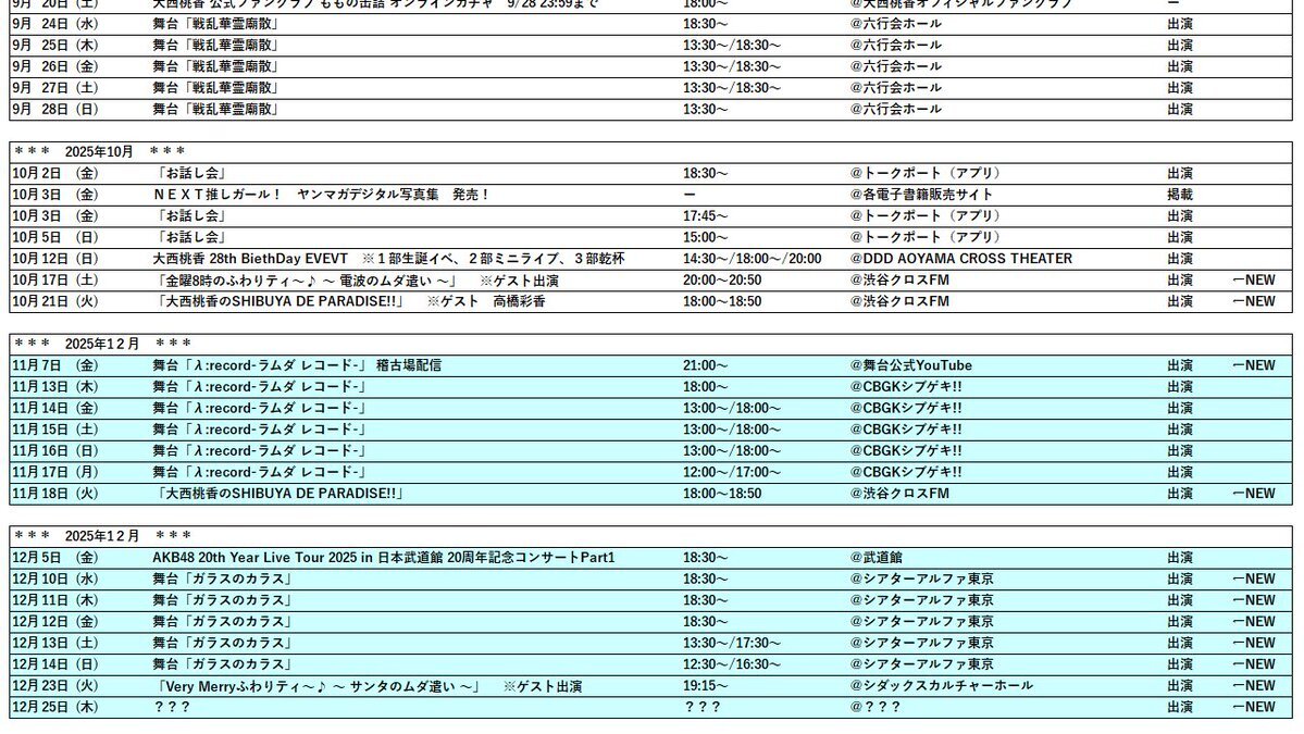 桃ちゃん🍑足跡&予定更新😊 #大西桃香 今後の予定🗓️ 11/7 ラムダ稽古場配信📡 11/18 次回シブパラ📻 12/10〜14 舞台ガラスのカラス🐦⬛ 12/23 ふわりティ(リベンジ)📻 12/25 ⁇ 🎄 クリスマス🎄の情報公開楽しみですね😊 pic.x.com/CRs6V1gF18