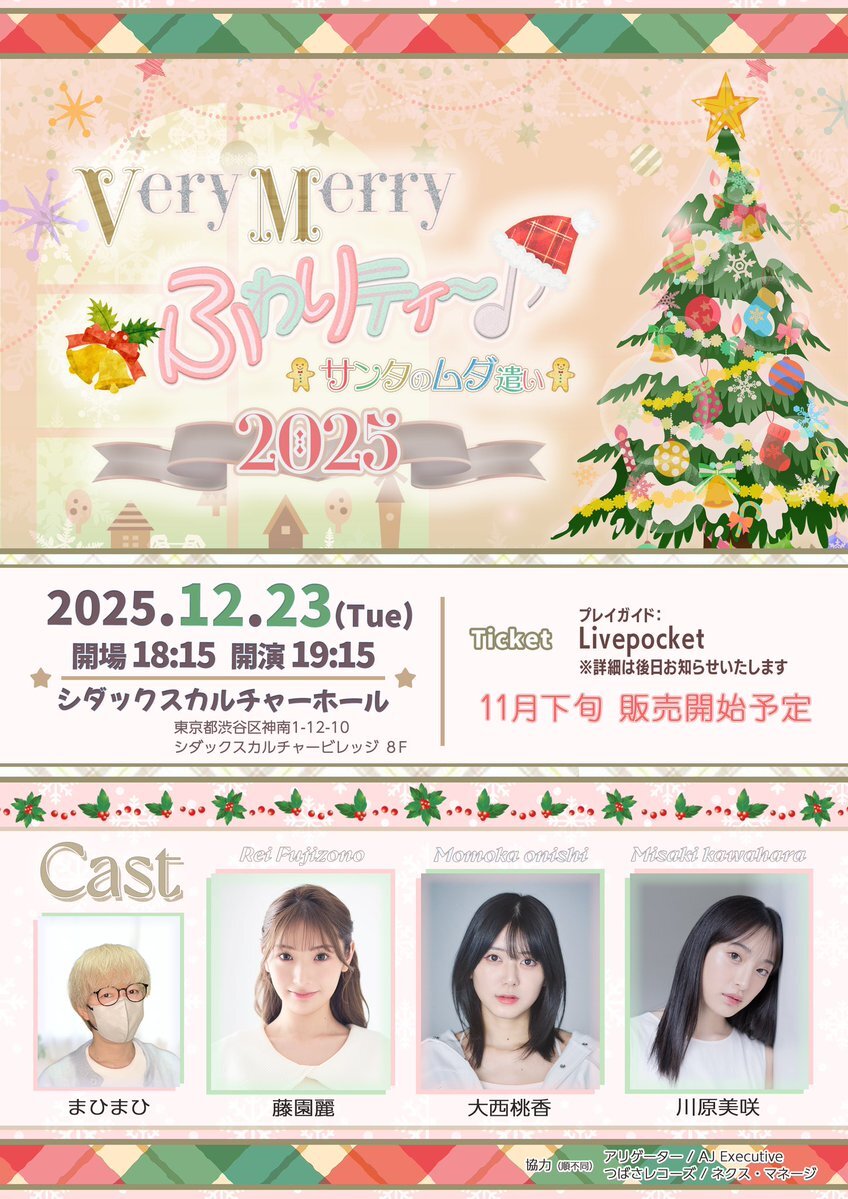 📣お知らせ Very Merry ふわりティ〜♪ 〜サンタのムダ遣い2025〜 \\ 昨年のリベンジ公演開催決定🎄 // ◉日時 12/23 (火) 19:15開演 📍シダックスカルチャーホール(渋谷) ◉キャスト 大西桃香 川原美咲 藤園麗 まひまひ ※チケット詳細は後日ご連絡いたします #ふわムダ
