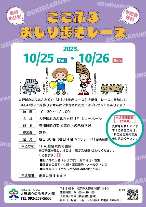10/25(土)・10/26(日)の「#ここふるおしり歩きレース(事前申込制・参加無料)」は、申込期間を延長しています💡 #おしり歩きレース に参加して楽しい思い出を作りませんか?😆参加された方にはプレゼントもあります🎁対象は、参加日時点で3歳以上の未就学児です👧🏻👦🏻 #おしり歩き #大野城 #福岡 pic.x.com/rHYd7mUPEc
