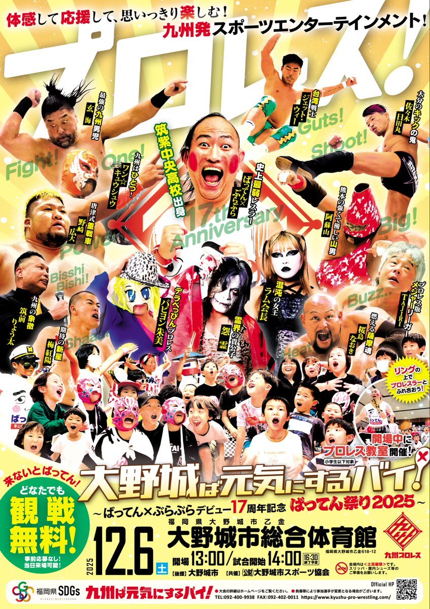 【12.6(土)大野城大会〜ばってん祭り〜】第1試合カード決定‼️ ▶️〈6人タッグマッチ〉 ばってん×ぶらぶら&佐々木日田丸&梅紅陽 vs 阿蘇山&桜島なおき&ワン⭐︎キュウシュウ 📝 ばってんが第1試合に出場!オープニングマッチから大野城大会ば盛り上げますバイ! #九州プロレス #qpro #大野城 pic.x.com/b9Kf5BHxlm