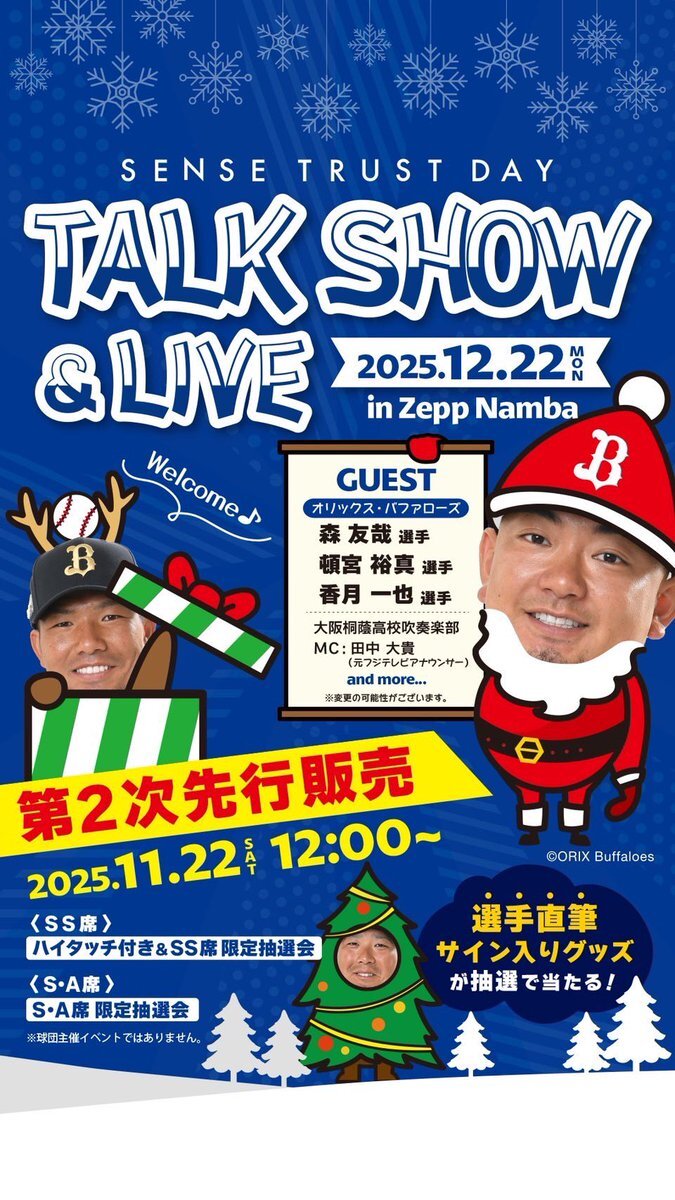 🔥12月22日より販売START🔥 📅開催日:2025年12月22日(月) 📍会場:Zepp難波 こちら注目イベントです✅ #森友哉 #頓宮裕真 #大阪桐蔭 #関西注目イベント #クリスマストークショー #センストラスト #bs2025 pic.x.com/D8y0oq7S3E