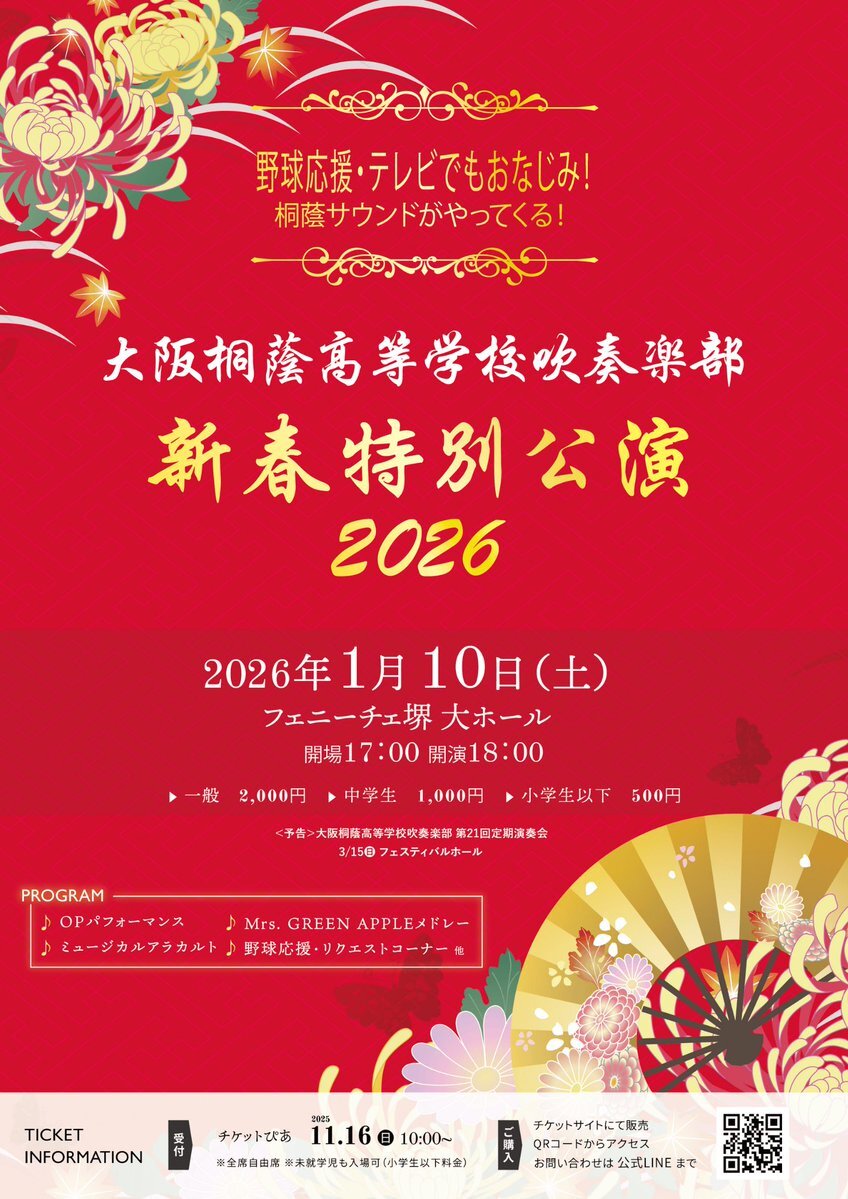 【新春特別公演2026🎍】 #大阪桐蔭 高等学校吹奏楽部 『新春特別公演2026』を開催します🙌 2026年1月10日(土) フェニーチェ堺 大ホール 2026年の音はじめは #吹奏楽 でいかがですか🎷 チケットぴあにて 11月16日(日)10:00〜販売開始🎫 皆様のご来場をお待ちしております♪ pic.x.com/vTasYEWJh5
