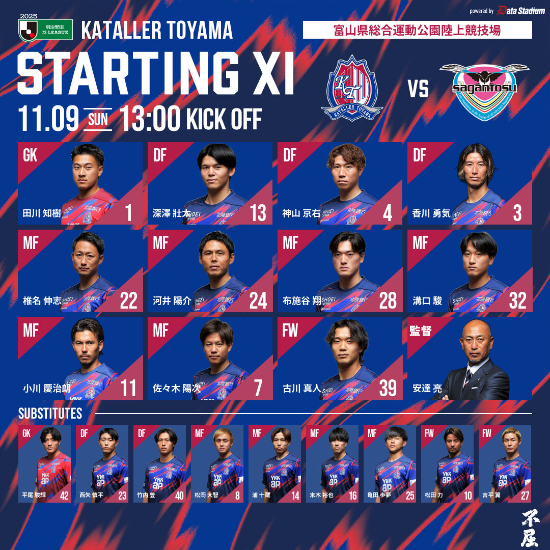 🏆明治安田J2リーグ 第36節🏆 #カターレ富山 🆚 #サガン鳥栖 スタメン発表🔥 熱い応援をよろしくお願いします‼️ #DAZN での応援はこちらから ✅bit.ly/3SECGb8 #J2 #Jリーグ