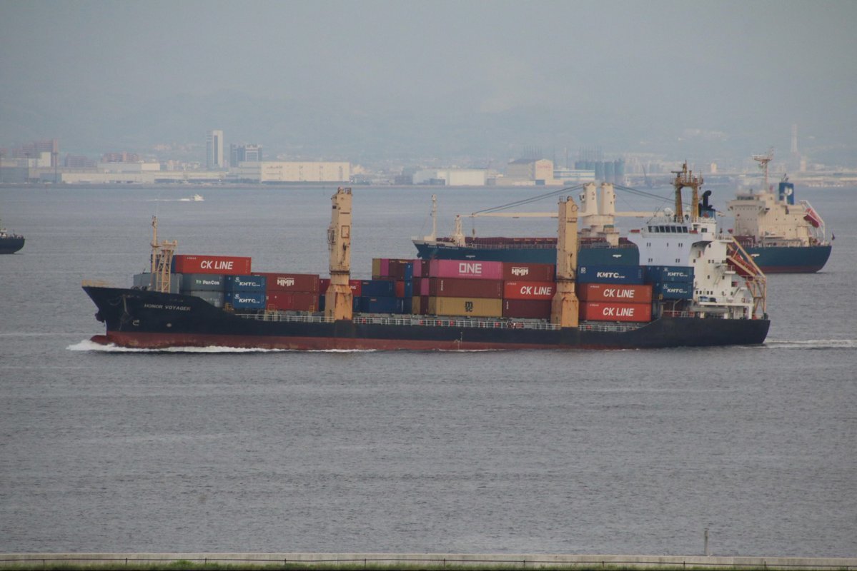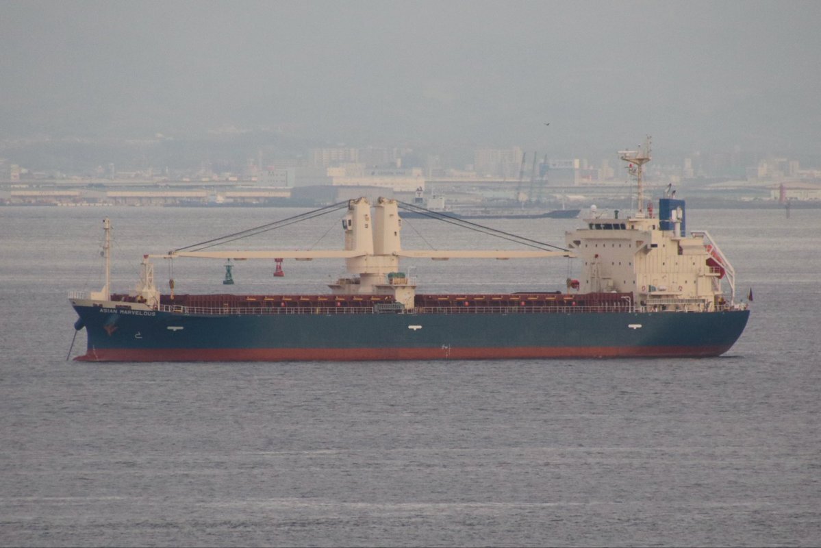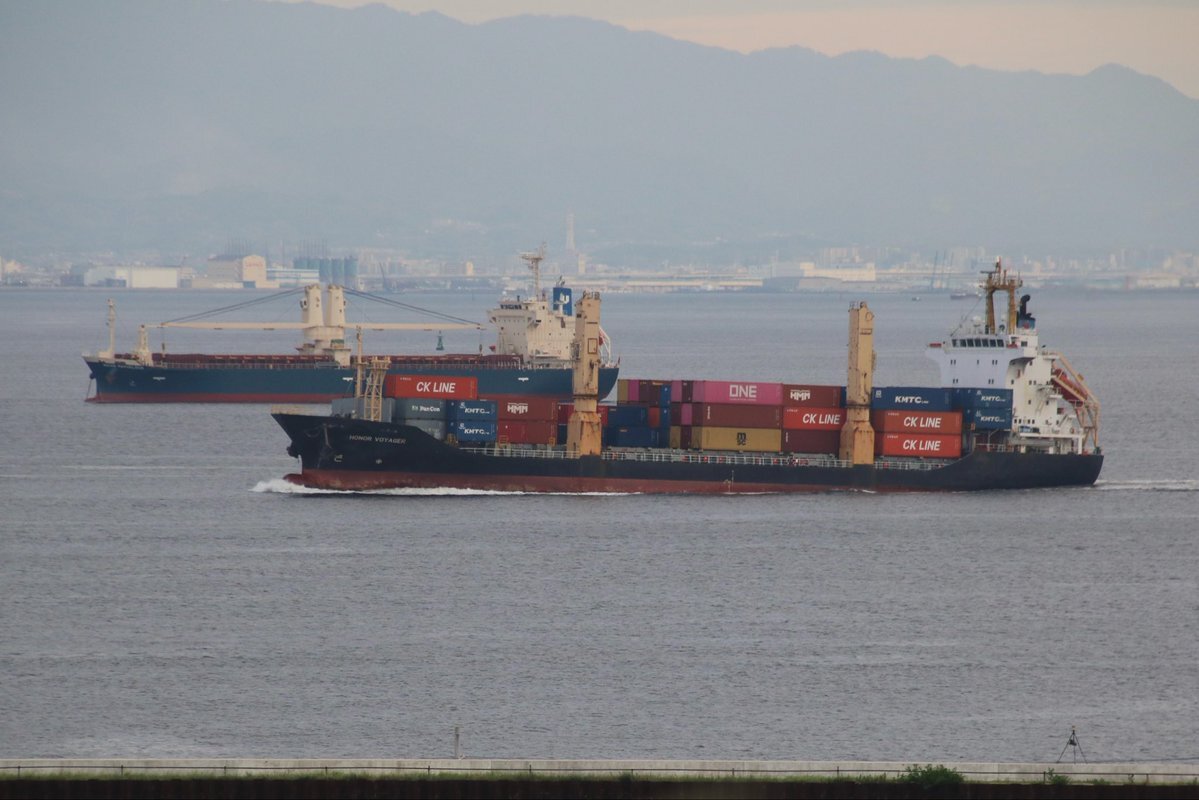 #シップウォッチング #コンテナ船「HONOR VOYAGER」全長121.9m、全幅21.8m #ばら積み貨物船「ASIAN MARVELOUS」全長119.93m、全幅21m 万博会場の大屋根リングから撮影 2025.9.24 #大阪湾 pic.x.com/4PXf5BRAPy