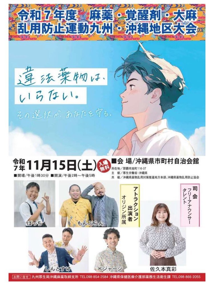 違法薬物乱用防止運動九州沖縄地区大会。明日11月15日(土)14時より自治会館にて開催、入場無料。特に若年層への啓発が急務です! #薬物乱用防止 #大麻 #エトミデート pic.x.com/XWYMD3UL1Q