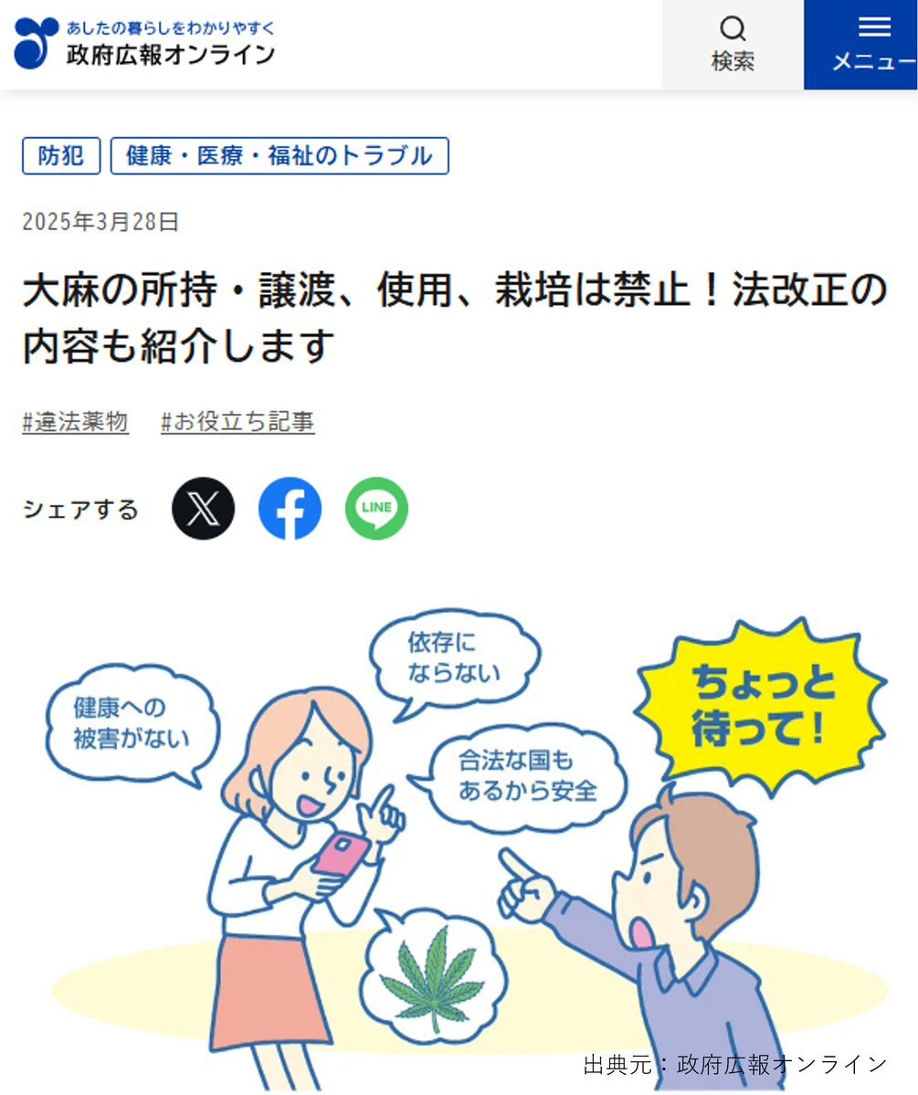 政府広報オンラインでは「大麻の被害から自分や大切な人を守るために、正しい知識を身に付けましょう。」と注意喚起しています。 令和5年(2023年)に大麻取締法が改正され、「使用」が禁止されるなど規制がさらに強化されました。詳しくはこちら👇 gov-online.go.jp/useful/article… #大麻 pic.x.com/5IJuB5F80u