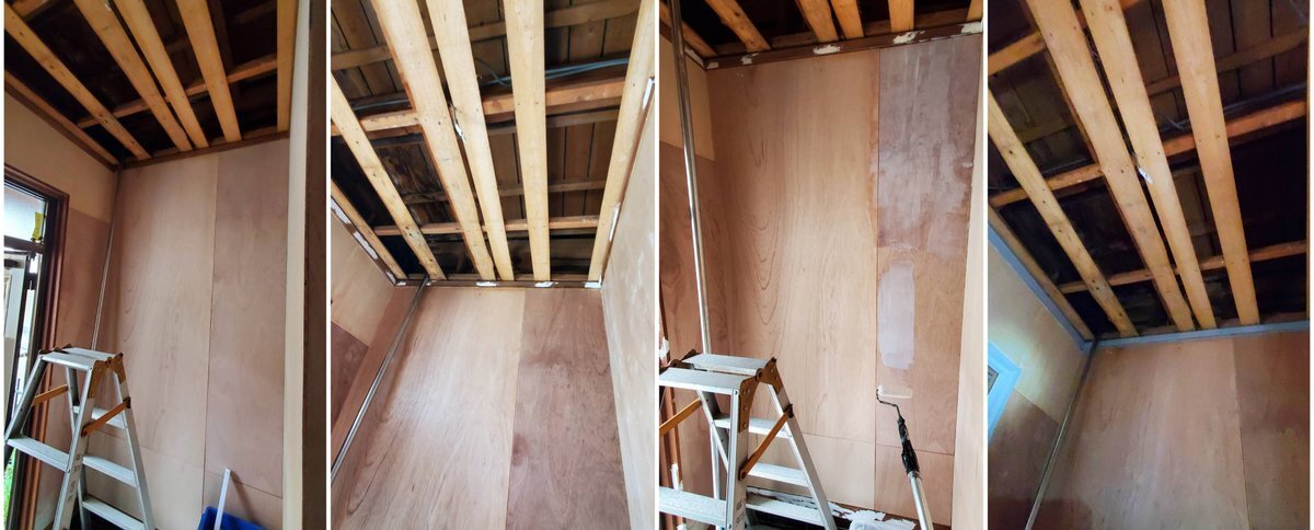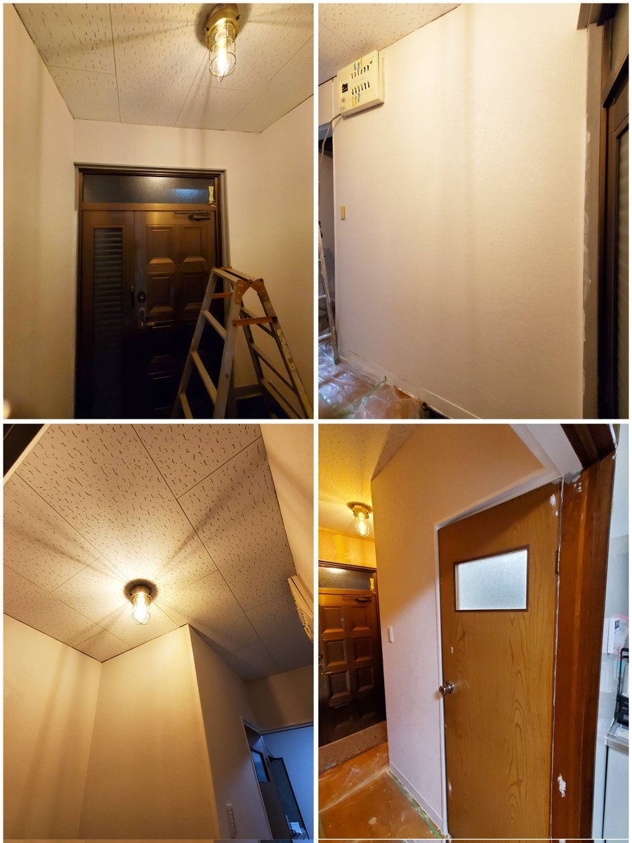 出入りで汚れるだろうから…と後回しにしていた #玄関 周りに着手🙋 #天井 はベランダ下の隅っこに雨じみがあったので #ジプトーン を全貼り替え💪 #プリント合板 の壁は5.5mm合板を上張り&シーラー塗布して #壁紙 貼り✨あとは撤去した廻り縁を新しく付けたら仕上がるのかな~😊床はまだ🤣 #DIY pic.x.com/VLpc5a2pdT x.com/M2103O/status/…