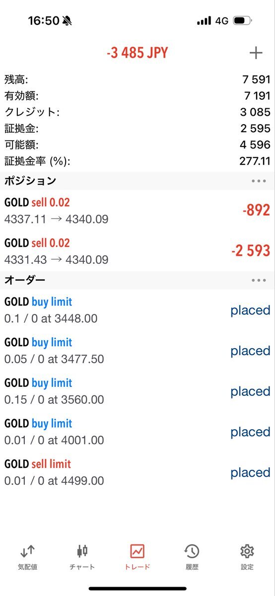 2万円追加して、早速6千円無くしました😂 ゴールド4337ドルから売り 目標3000ドルまでの大暴落💰 #ゴールド #売り #ショート #ベア #リスクオン #大暴落 #月足転換 #天井 #資金500倍 #両建てとピラミッディングで夢を現実に pic.x.com/gANPLoCyBm x.com/kk14779816/sta…