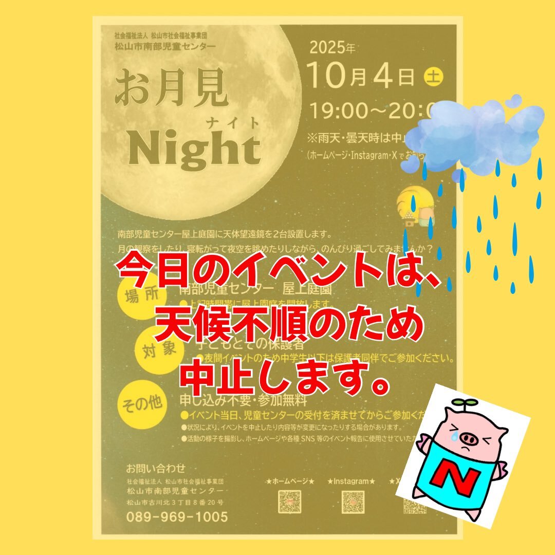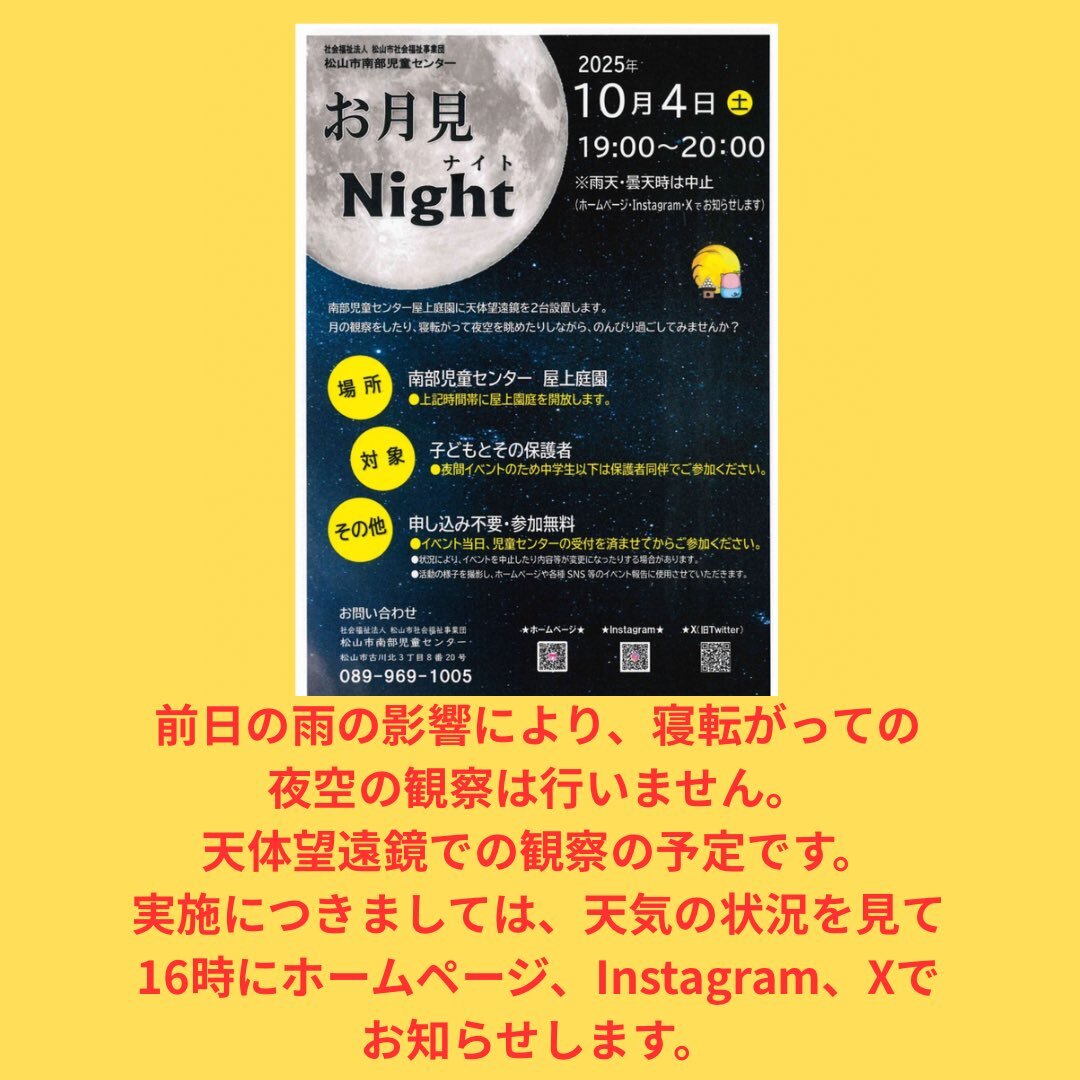 【本日のイベントについて】 本日開催予定のお月見Nightですが、 天候の状況を見て16時に実施について お知らせします。 #松山市 #松山市南部児童センター #こどもまんなか #お月見 #天体望遠鏡 pic.x.com/6r0llS0iak