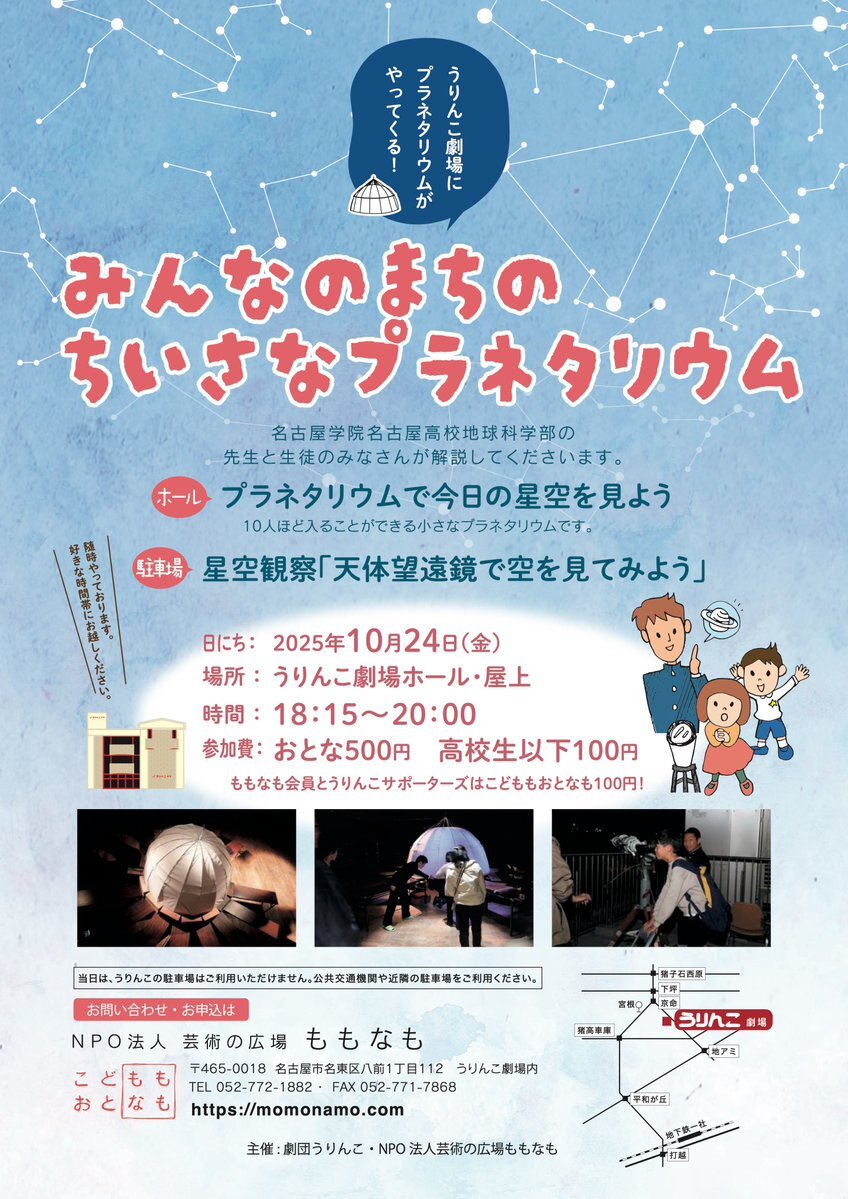 『みんなのまちのちいさなプラネタリウム』 うりんこ劇場にプラネタリウムがやってくる! 10人ほどはいるちいさなプラネタリウム。 #名古屋学院名古屋高校 #地球科学部 の生徒と先生が解説してくださいます。 天気が良ければ #天体望遠鏡 で #星空 をみよう! pic.x.com/cKRcv70lUo