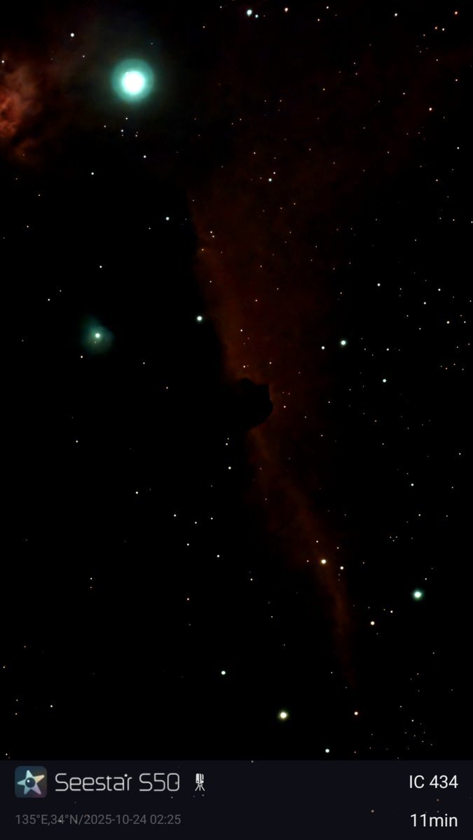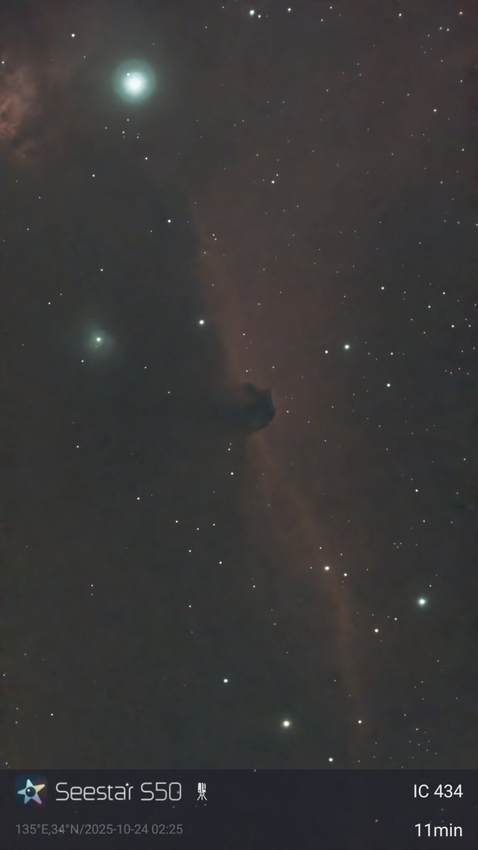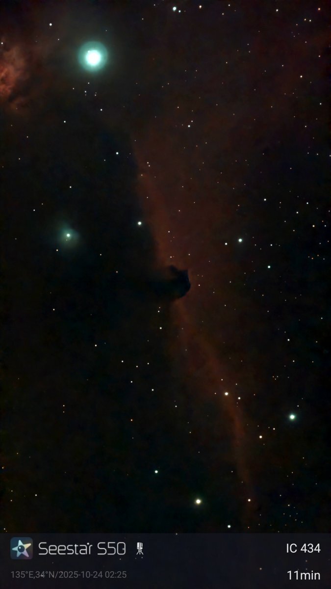 天体:馬頭星雲(IC434) 撮影日時:2025年10月24日 午前2時頃 撮影機材:Seestar S50(スマート望遠鏡) 撮影方法:4Kモードで11分間ライブスタック 画像処理:SeeStarアプリで「AIノイズ除去」と「コントラストおよび彩度」を補正 詳細:universe.joho.info/seestar/seesta… #seestar #天体写真 #天体望遠鏡 #馬頭星雲 pic.x.com/BABJ79MQLx