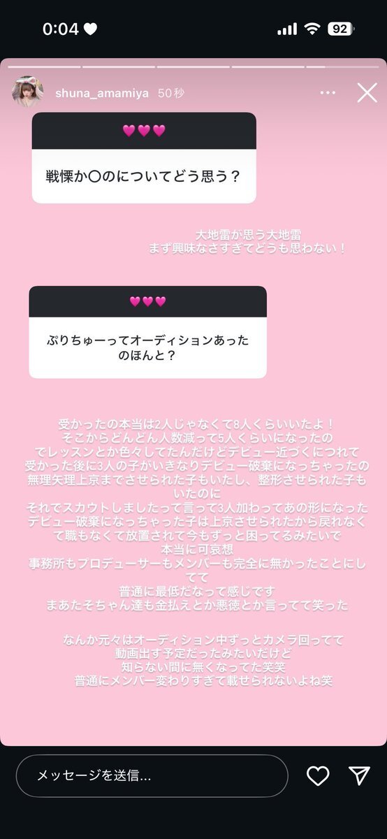 #PrettyChuu & #天宮しゅな さんについて、凄い情報が出てきましたね🧐 デビュー前に辞めさせられた人達の背景がわからないので、何とも言えません。 別の事務所からの出向という形での加入だったけど、元の事務所に内緒でバイトをやっていて、バレてクビとかですかね⁉️ #アイドル準備中 x.com/DEATHDOL_NOTE/…