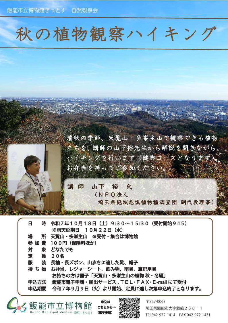 来月10月18日(土曜日)開催の #自然観察会 「秋の #植物観察 ハイキング」の募集期間を延長しました。定員に達し次第締め切りとなります。秋の #天覧山#多峯主山 の植物たち をご堪能ください。 下記リンクから電子申請、またはTEL・FAX・E-mailにてご応募ください。 apply.e-tumo.jp/city-hanno-sai… pic.x.com/8I2uxN0l05