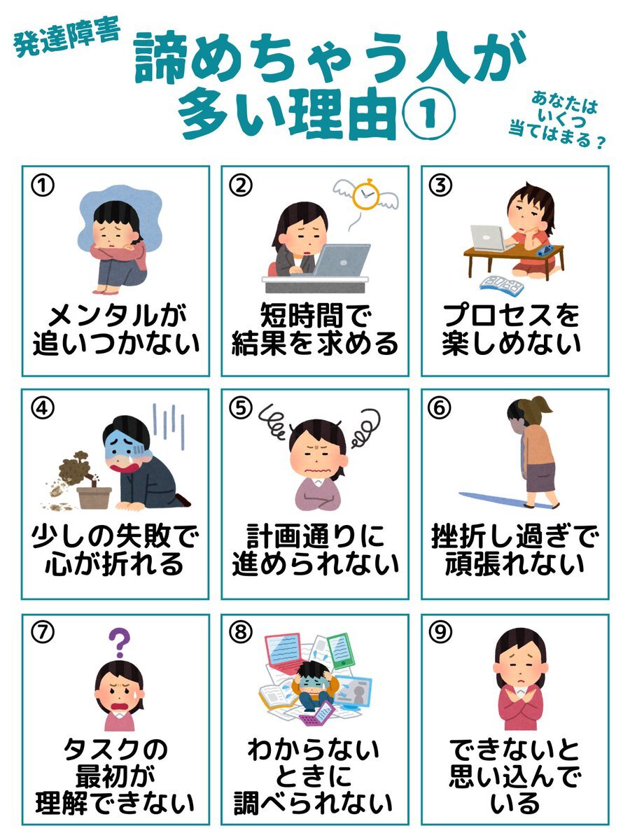 発達障害があると、何事も諦めがちになりませんか😔 みなさんは当てはまる項目ありましたか? 明後日に②を投稿しますので、ぜひチェックしてください✨ #失敗 #挫折 pic.x.com/NlI3g23Kg1