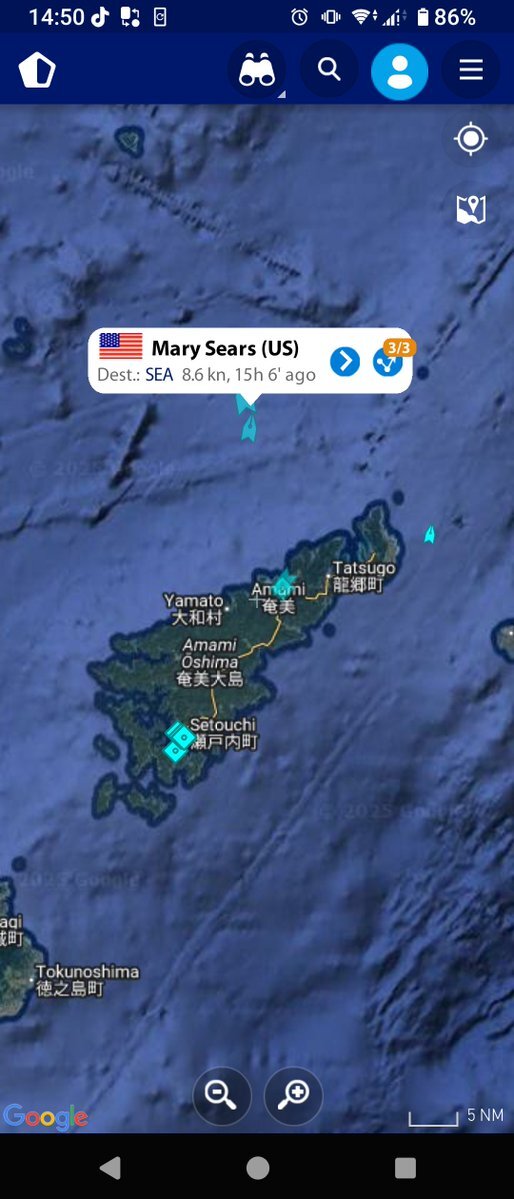 アメリカ海軍の音響探査や海底の質採取など対潜水艦戦用の 海洋環境データ収集などが任務の海洋調査船 「 MARY SEARS(マリー・シアーズ)T-AGS-65 」② 2025.11.20 (木) 14:50 マリー・シアーズの行先は海上です #奄美大島 pic.x.com/UnkiL51fjx