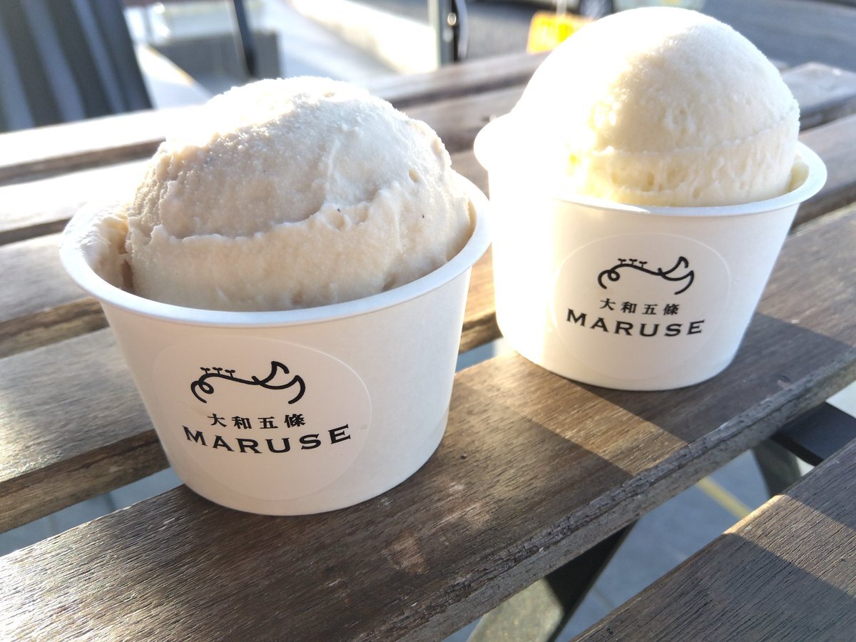 たいへんお気に入りの果樹園さんがしているジェラート屋さん。 右が梅で左は天日干し番茶 #MARUSE #奈良県五條市 pic.x.com/OrR26vq0v9