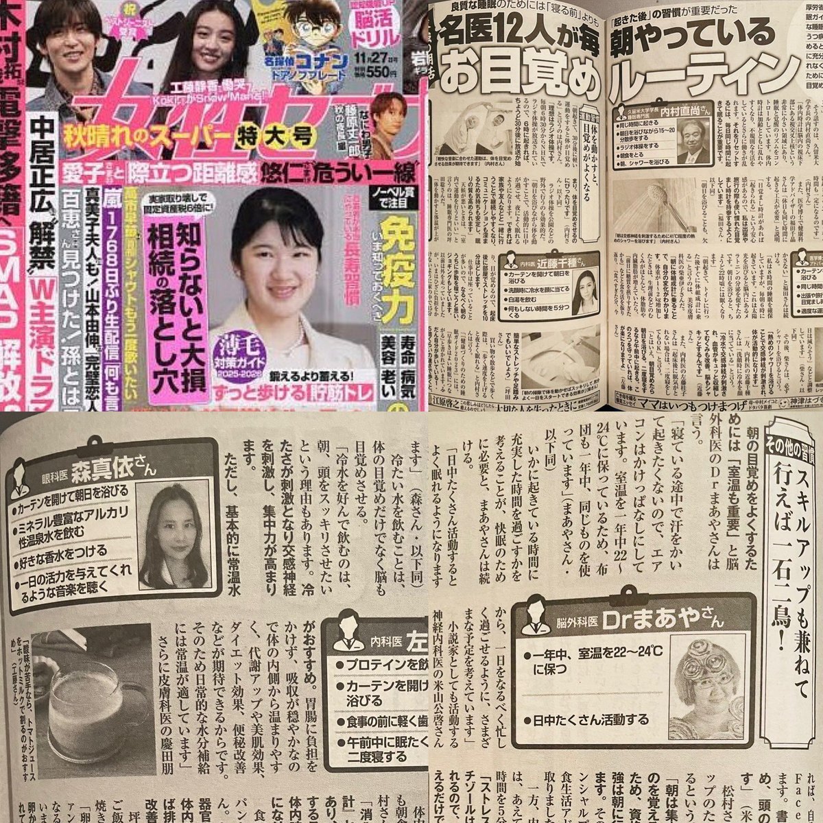 【脳外科医 #Drまあや】 【内科医 #近藤千種】 【眼科医 #森真依】 女性セブン(小学館) 「名医12人が毎朝やっている お目覚めルーティン」 活版4ページ特集、コメント記事掲載! 11/10発売。 #カロスエンターテイメント #女性セブン #小学館 #女性医師 #名医 pic.x.com/JumHb5lMT5