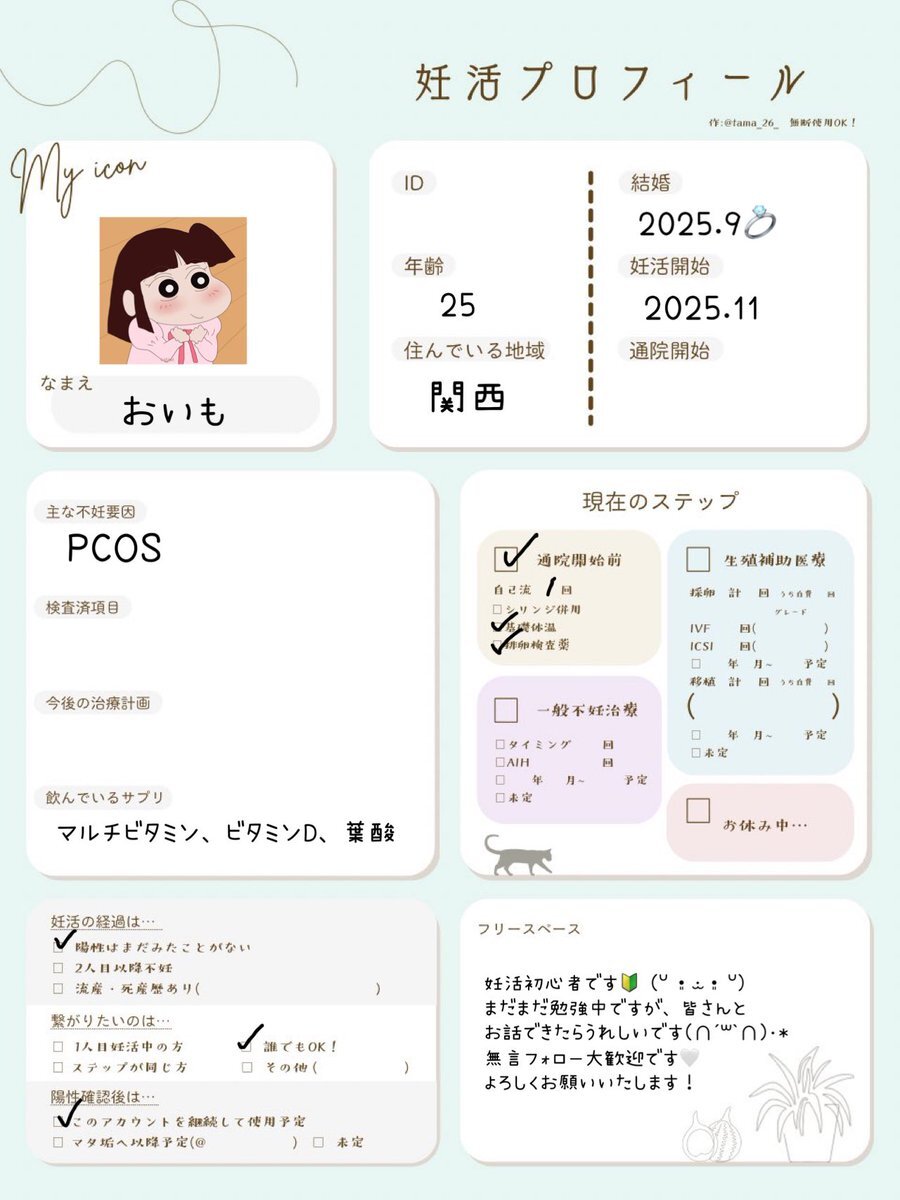 妊活初心者です🔰(ᐡ •͈ ·̫ •͈ ᐡ) あまり周りに話せる人もいないので、是非皆さんと繋がれたら嬉しいです♡ 無言フォロー失礼いたします🙇♀️ @tama_26_ さんのテンプレお借りしました! #妊活垢さんと繋がりたい #1人目妊活 #妊活垢 pic.x.com/vvSErZg7g7