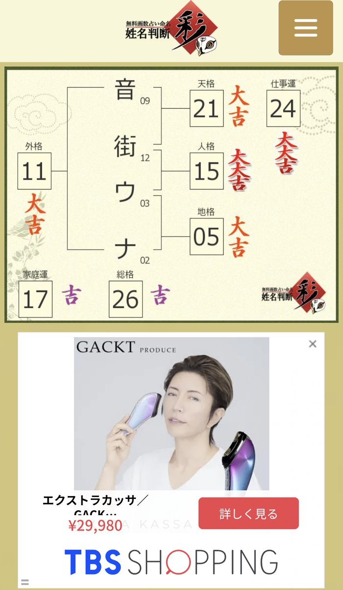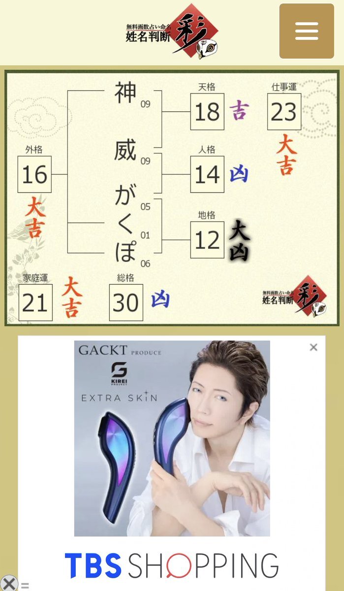 音街ウナの姓名判断最強説は本当だった…!∑(・ω・ノ)ノ 神威がくぽでも診断してみたけど大大吉は難しいですね〜🍆( ੭⌯᷄ω⌯᷅ )՞ ՞ 下の広告にGACKTお父上が出て来たけどがくぽを応援してるのかな💜ฅ(■-■ฅ)←絶対違います😎 ちなみに御守りも買いました💖🤗 #神威がくぽ #がくっぽいど #姓名判断 pic.x.com/2pDrmnX1mh x.com/otomachiuna/st…