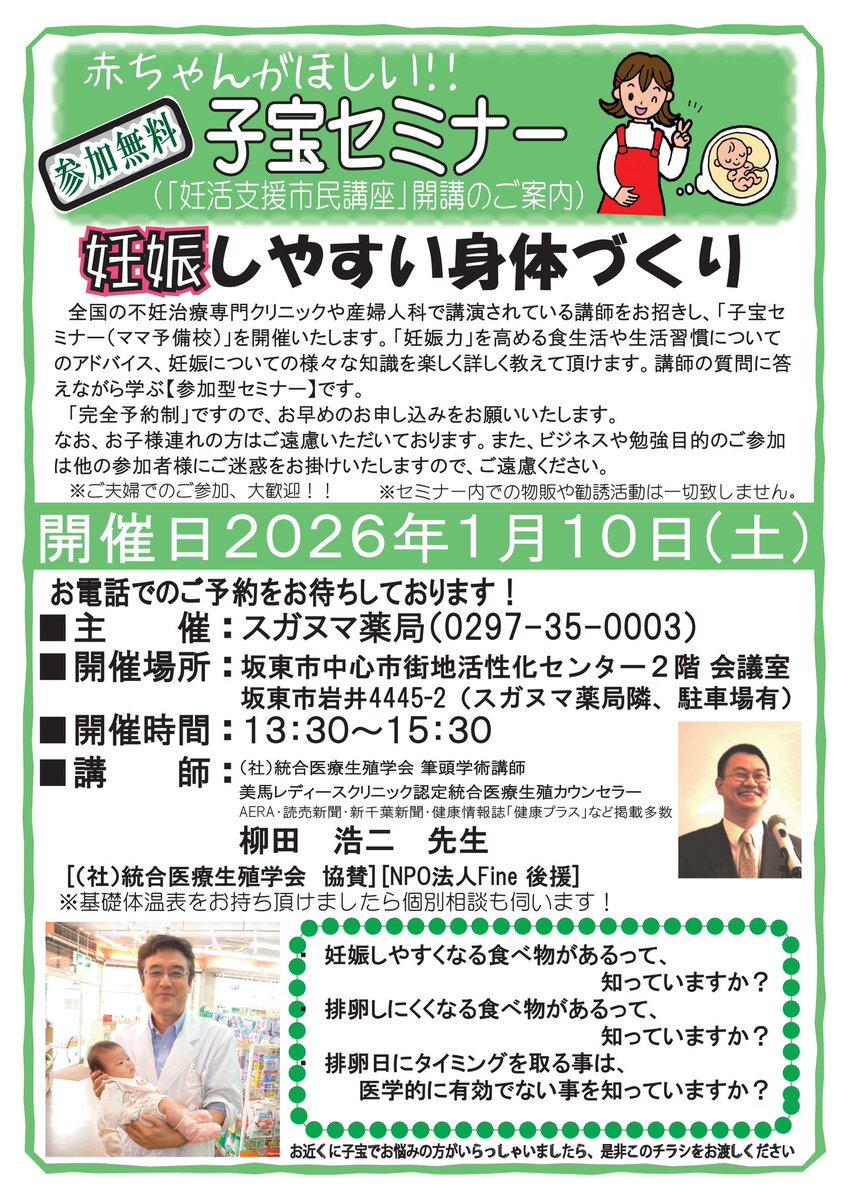 子宝セミナー(妊活支援市民講座) in 茨城 2026年1月10日(茨城県) - こくちーずプロ kokuchpro.com/event/6d2566d3… @kokuchproより #不妊 #子宝 #セミナー #妊娠 #妊活 #個別相談会 #人工授精 #体外受精 #顕微授精 #柳田浩二