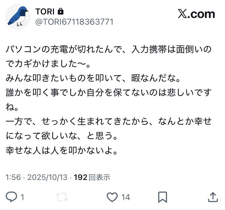 返信先:@TORI67118363771> よっぽど現実世界で満たされてないんですね。お気の毒です。 ほら論点ズラしてんじゃねぇか笑 あと、現実世界に満たされてないのはそちらじゃないですか❓満たされてないから学校へ不満漏らしてんでしょ🤭 #子持ち様(笑)