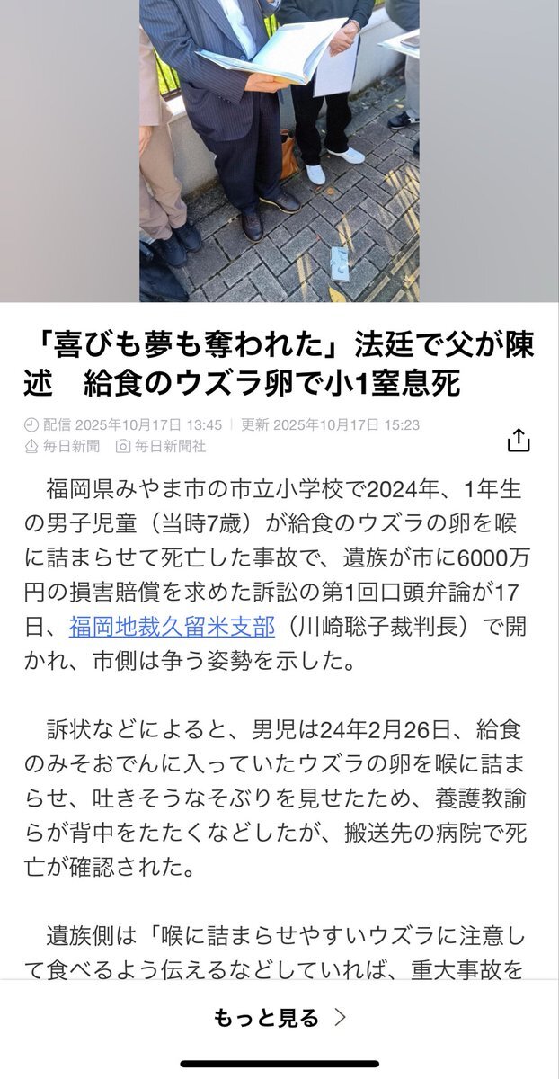 【初弁論】「ひと言注意してくれていたら息子はかんで食べていた」給食のウズラの卵をのどに詰まらせ小1死亡 父が意見陳述。 父親は市に6000万円の損害賠償を求めている xsokuhou.net/archives/12174…