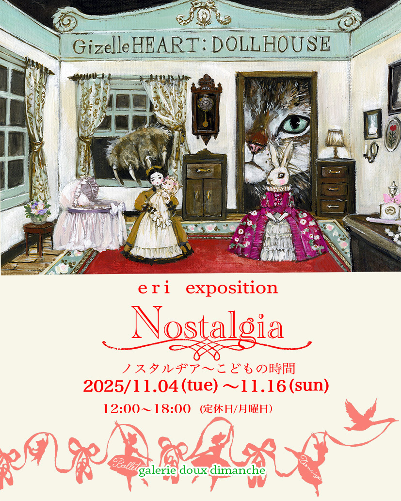 イラストレーターe r iによる展覧会を開催します。 【Nostalgia~ノスタルヂア こどもの時間】 📅 会期:2025年11月4日(火)~11月16日(日) 🕰 時間:12:00~18:00(月曜定休日) 📍 会場:galerie doux dimanche(ギャラリー・ドゥー・ディマンシュ)