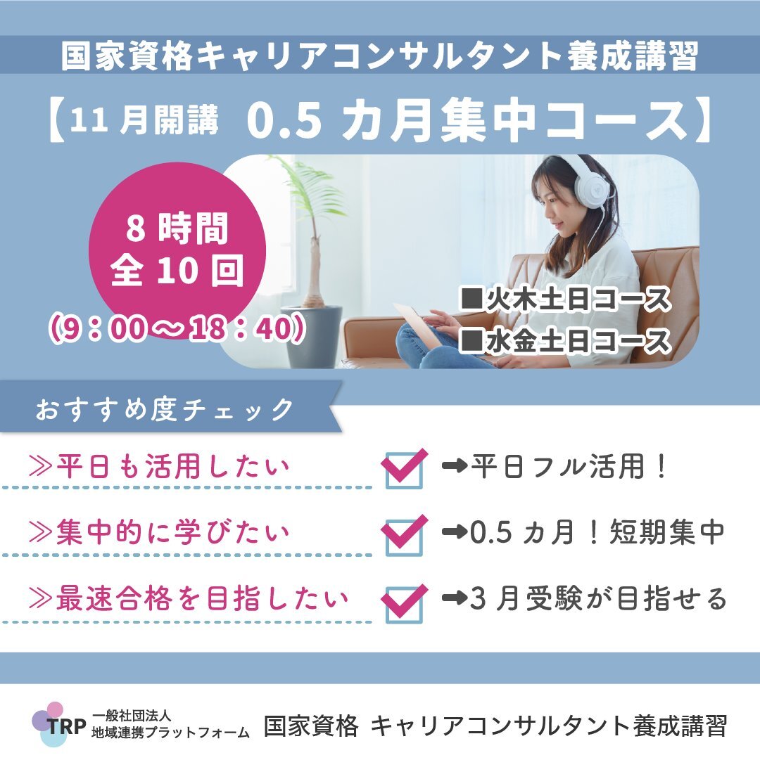 集中だから深く学べる。 サポートが手厚いから続けられる。 仲間がいるから心が折れない。 そんな声が多い0.5ヶ月コース✨ ⏳【11/17(月)13:00締切】 このコースだけが、3月試験に間に合う最後のチャンスです。 🔽詳細 careerjp.work/cc1/kouzamoush… #キャリコン #資格取得 #学び直し #キャリア支援 pic.x.com/XnymNZHSu7