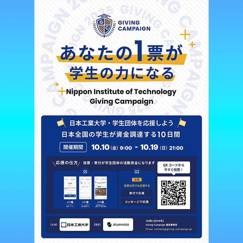 / 📣 #学生応援 イベント💫 \ 【#GivingCampaign 2025】 開催‼️ 🗓️10/10(金)〜10/19(日) 応援したい課外活動団体へ💪 スマホから“1票”を📱 あなたの応援が #日工大生 の力になります✨ 特設ページはこちら👇 nit.2025.giving-campaign.jp 在学生・卒業生・親御様・一般の皆さま pic.x.com/XIJ3R5CTCU x.com/gc_japan_univ/…