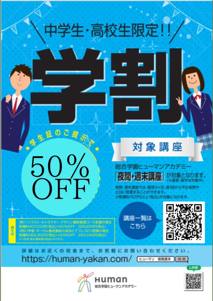 🎉中高生限定🎉 ヒューマンアカデミー秋葉原校 夜間・週末講座 今なら受講料50%OFFキャンペーン実施中‼️ 学びたい気持ちを今すぐカタチに! このチャンス、見逃すな🔥 #ヒューマンアカデミー秋葉原校 #学生応援 #半額キャンペーン pic.x.com/NeGNhvfxxd
