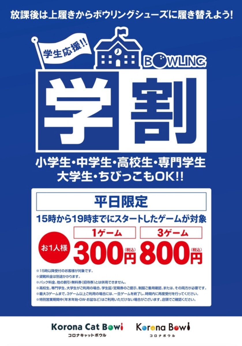 🎓放課後はコロナボウルへGO!🎳 学割実施中🔥 平日15時〜19時にスタートで 1ゲーム300円/3ゲーム800円(税込)✨ 小・中・高・大・専門学生、ちびっこもOK👶 友達とワイワイ放課後ボウリングしよう! #学割 #ボウリング #学生応援 #放課後レジャー #コロナボウル #コロナキャットボウル pic.x.com/TToFKqZCXi