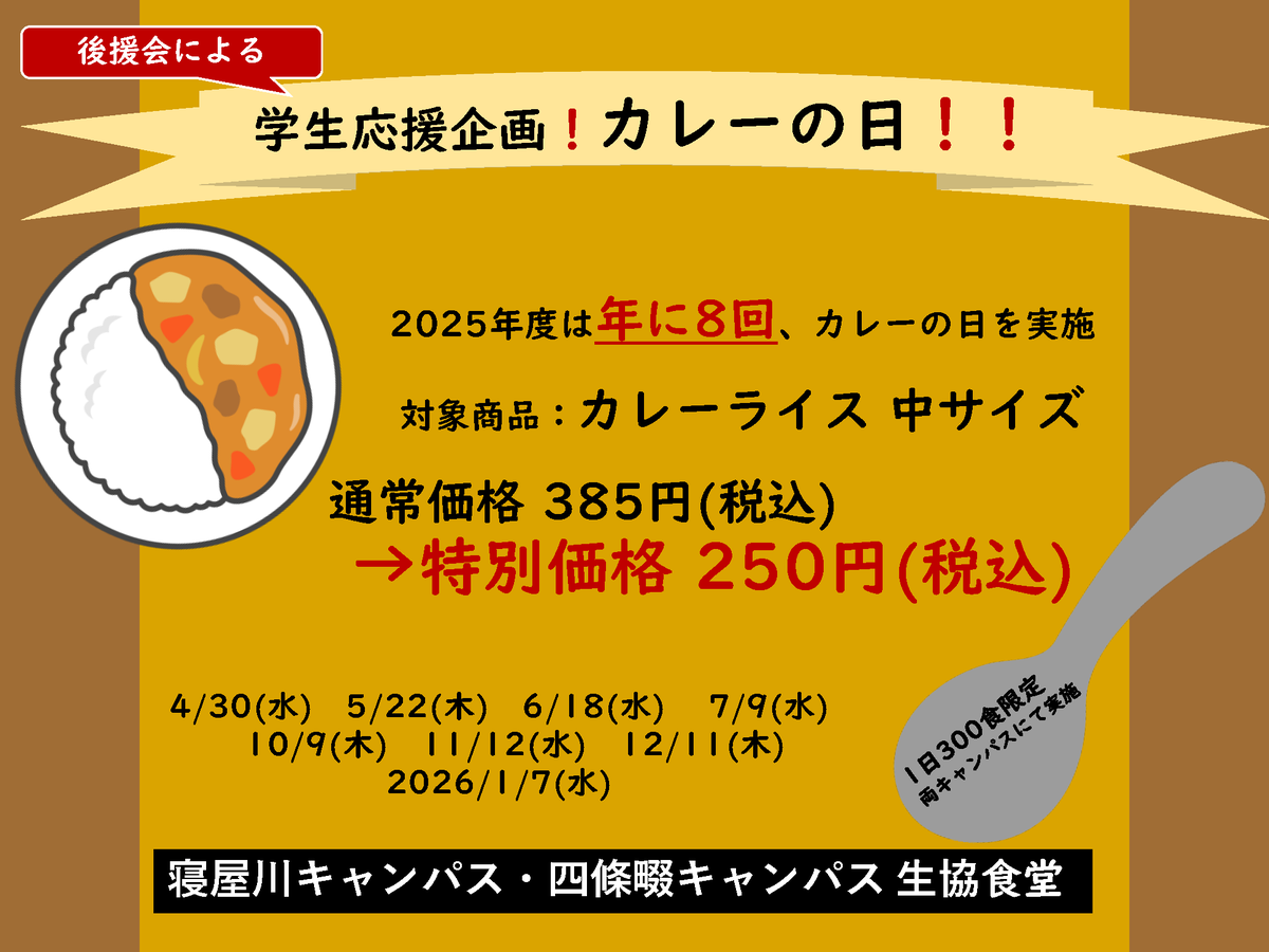 🍛学生応援企画 #カレーの日 🍛 カレーライス中サイズが 385円→なんと250円‼️ 300食限定🎯 寝屋川・四條畷 両キャンパスの生協食堂で開催中! 寝屋川・四條畷の生協食堂へ急げ〜🏃‍♀️💨 #大阪電気通信大学 #学生応援 #生協食堂 #お得情報 pic.x.com/QYaJtFNNKs
