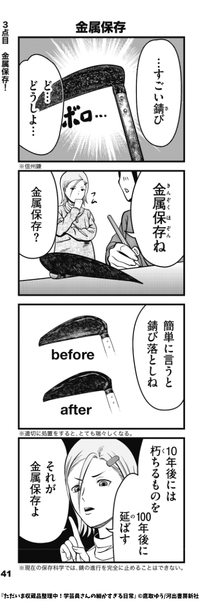 本業の告知が埋もれてきたので、自著漫画作品紹介。 『ただいま収蔵品整理中!』 amazon.co.jp/dp/4309291252/ 知られざる郷土資料館での貴重な収蔵品(資料)の調査・整理作業を描いた4コマ漫画です。 #博物館 #学芸員 #資料館 #漫画 #河出書房新社 #鷹取ゆう pic.x.com/3rFoL7TI5I