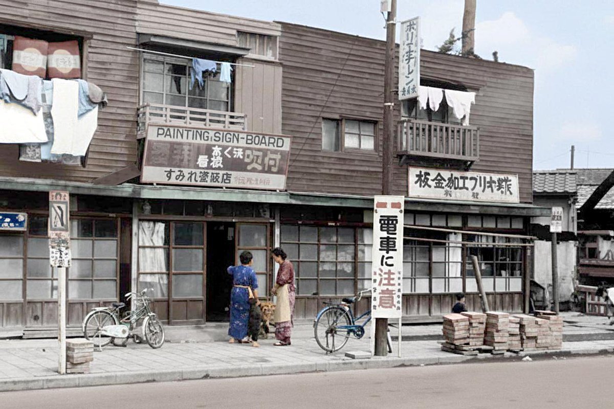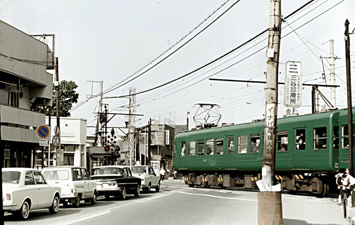 1966年(昭和41年)、駒沢通りと東横線が交差する地点のモノクロ写真をカラー化。東横線の車両は"青ガエル"。まだ路面で踏切(学芸大学あたりの高架化が完了したのは1970年ごろ)。次リプでカラー化もう一発。すごい動画があるので、その先の説明もぜひ #学大カラー化 #学芸大学 #学大 pic.x.com/mkPKLkvf5Q
