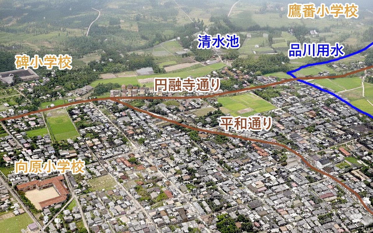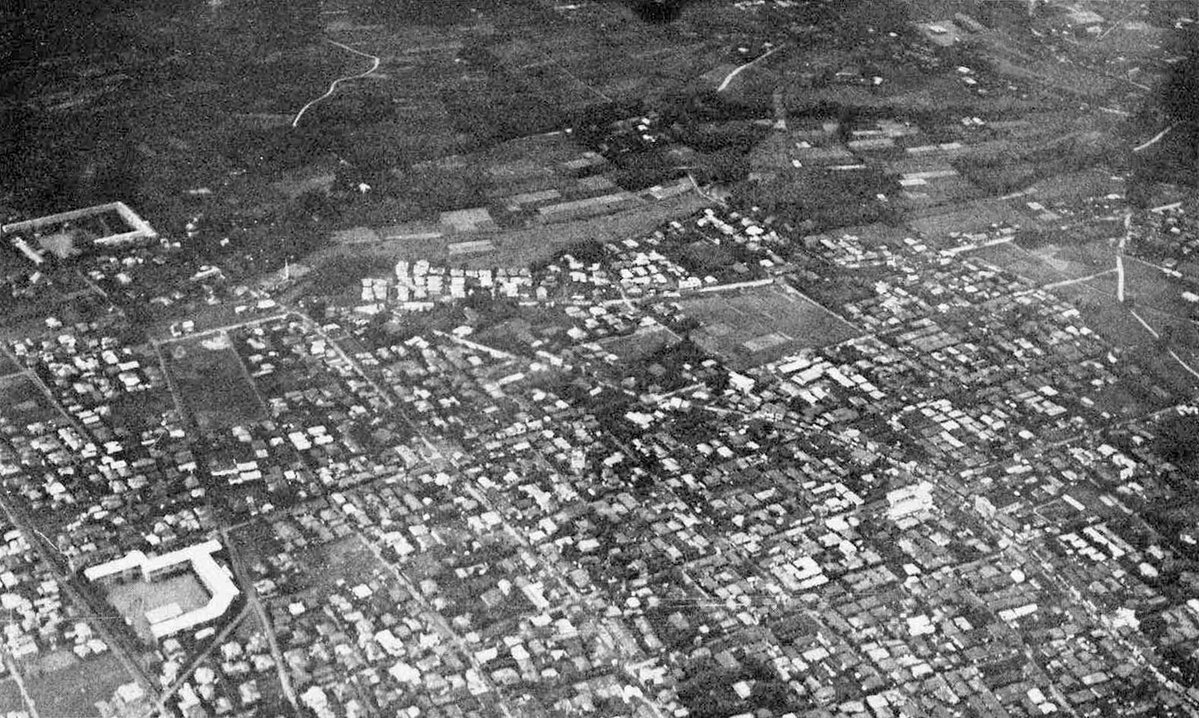 1930年前後の学芸大学(目黒本町中心)、碑衾町時代の航空写真をカラー化。以前カラー化したものより南、平和通り(武蔵小山/当時は富士館通り)を中心に、向原小学校(西小山)あたりまで。改めてこれを見て、すごいものを発見してしまった。まさにその富士館! #学大カラー化 #学芸大学 #学大 pic.x.com/lhYEH1RQoN