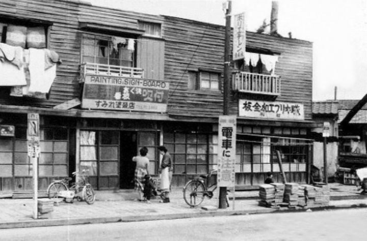 これはその2年前、1964年(昭和39年)。ほぼ同じ場所からカメラを50cmほど左に振って撮った写真。コンクリマンション以前の板張り木造長屋風。たった2年、たった50cm違うだけでも随分と雰囲気が異なる。学芸大学の変化が如実に感じられる2枚 #学大カラー化 #学芸大学 #学大 pic.x.com/0bqOxC4sp3