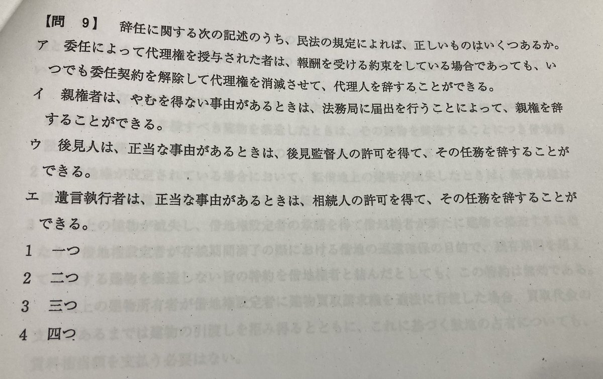 令和四年宅建試験問題 問9 私の回答① 理由はエのみ正解 遺言執行者は、正な事由があるときは、相続人の許可を得て、その任務を辞することができるため #宅建士 #宅建試験 pic.x.com/vzR9KIYddN