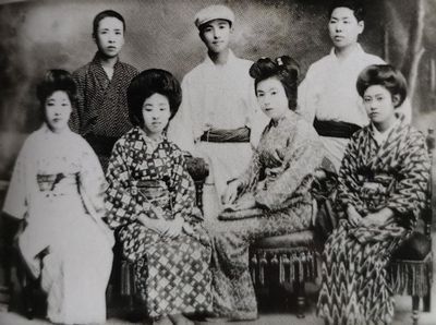 代用教員時代に女学校時代からの文学仲間の女子4人と男3人で回覧雑誌「海鳥」を始める(写真はその同人。千代は前列右から2人目)。製本もせず、原稿をリボンで綴じただけのもので、内容も幼稚なものだった。化粧した千代は女学校時代の地味さは消え、見違えるほど派手で別嬪だった。#宇野千代 第22話