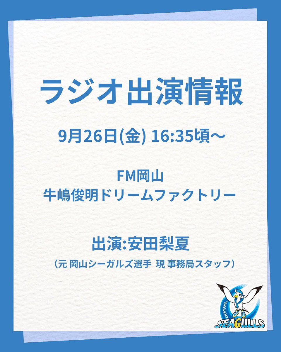 【ラジオ出演情報📻】 明日、9月26日(金)、FM岡山 #牛嶋俊明ドリームファクトリー(15:00~18:30)内の #スポーツファクトリー のコーナー(16:35頃~)に、元岡山シーガルズの選手で、今月から事務局スタッフとして活動している #安田梨夏 が出演します! pic.x.com/ZKn5HjrXe8