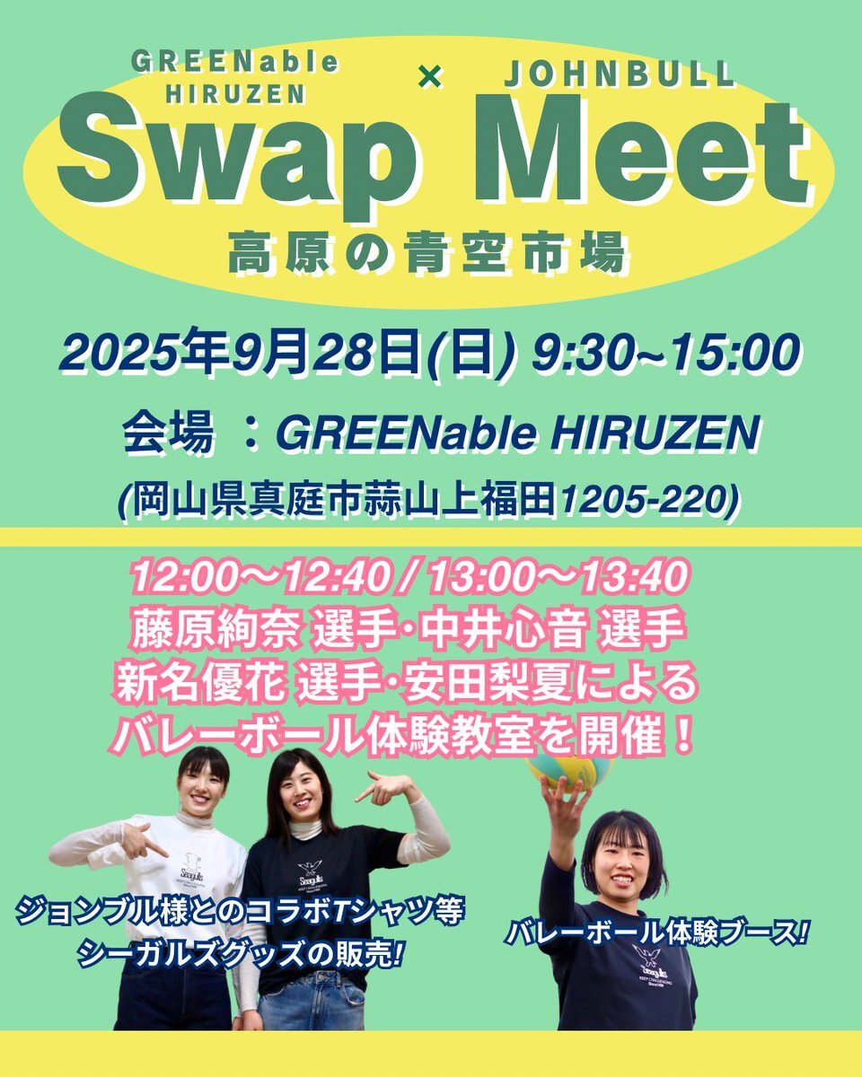 本日は #株式会社ジョンブル 様のイベント『Swap Meet 』に参加しています🙌🏻 バレーボール体験ブース、JOHNBULLコラボTシャツ等のグッズ販売を実施中💁♀️ 12:00〜12:40 と 13:00〜13:40 は、#藤原絢奈 選手、#中井心音 選手、#新名優花 選手、#安田梨夏 による #バレーボール体験教室 pic.x.com/cyfYpzsxis x.com/okym_seagulls/…