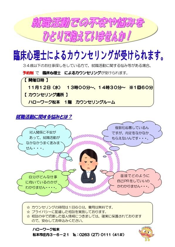 【11/12(水)臨床心理士による巡回相談のご案内】 34歳以下のお仕事探しをしている方で就職活動に関する悩み等がある方。不安や悩みをひとりで抱えていませんか?ハローワーク松本1Fカウンセリングルームで1回60分、臨床心理士による巡回相談を開催します。 #臨床心理士 #完全予約制 pic.x.com/8K4T6EtSlo