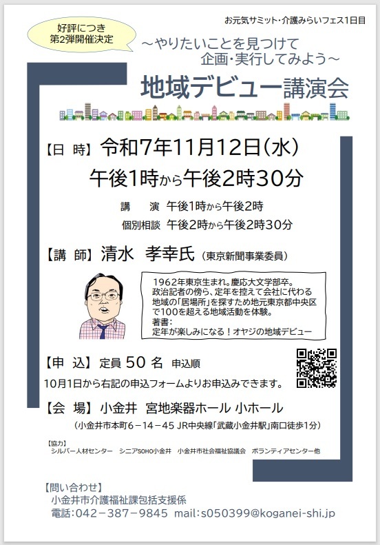 「地域デビュー講演会」~やりたいことを見つけて企画・実行してみよう~を開催します。いよいよ明日開催!残席わずかです。詳細は市HPへ。city.koganei.lg.jp/kenkofukuhsi/k… #地域デビュー #講演会 #koganeishi #小金井市 #社会参加 #シニア #定年 #セカンドライフ #地域活動 pic.x.com/xqtIfAdmvD