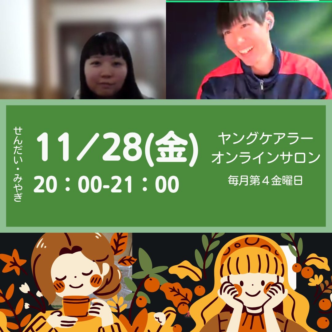 毎月第四金曜日はオンラインサロン🍠🍂 なんと年内の開催も残すところあと2回! 今月は11/28(金)20時から🙌 みんなでまったりお話してみませんか お申込はこちらからどうぞ▶lin.ee/KVOo6so #オンラインサロン #ヤングケアラー #仙台市 #宮城県 #無料相談 pic.x.com/CK3kA4CK1s