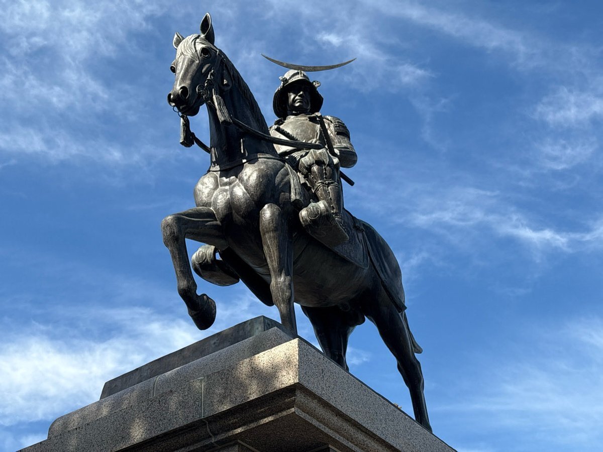 #仙台城】2025年11月5日 「独眼竜」の異名で恐れられた奥州の覇者。若くして南奥州を席巻後、時勢を見極め秀吉・家康に臣従。仙台藩初代藩主として慶長6(1601)年に仙台城を築き、産業や文化を振興して杜の都の礎を築いた。 #陸奥国 #宮城県 #日本100名城 (@ 伊達政宗公騎馬像 in 仙台市, 宮城県) pic.x.com/ZaOBeqKXn6